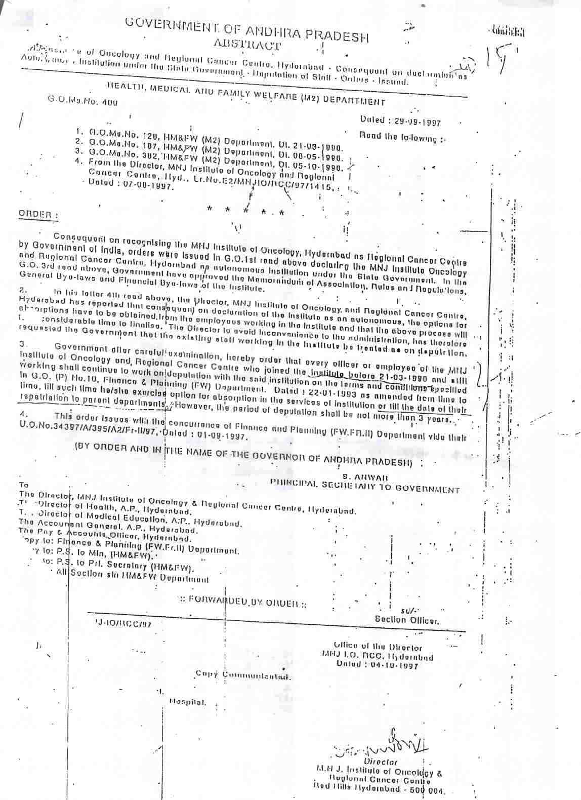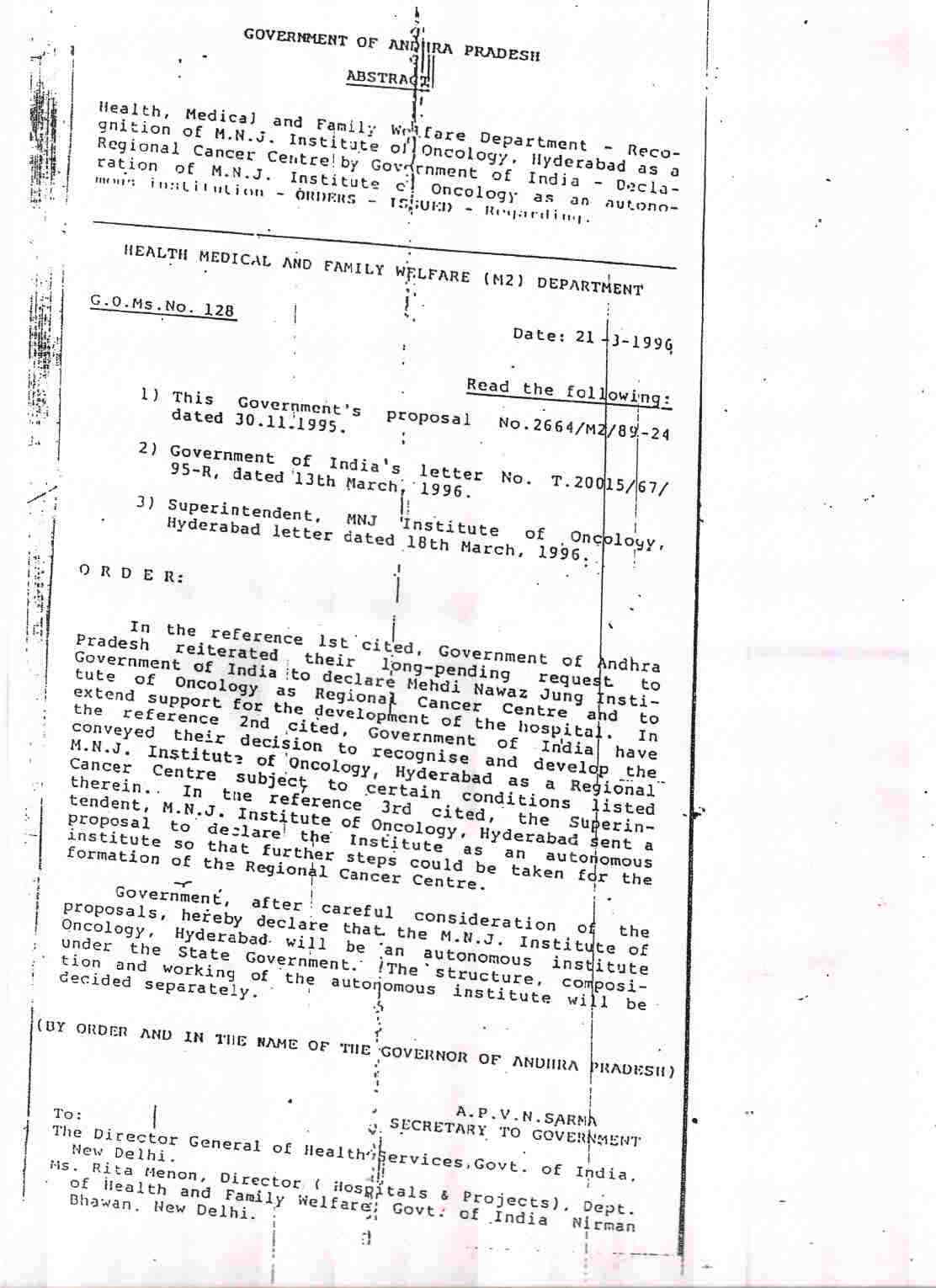 The MNJIO&RCC of this state had its origin as the Radium Institute & Cancer Hospital and was inaugurated by Pandit Jawaharlal Nehru as a near 40 bedded cancer hospital in 1955. The Govt. of India accorded the status of Regional Cancer Center on 12/03/1996. In compliance with the requirement of Govt. of India to accord RCC status to our institute, the Govt. of Andhra Pradesh declared MNJIO&RCC as an Autonomous Institute under State Govt. vide G.O.Ms.No.128 M&H, dt.21/3/1996 and the institute is registered as society to be governed by Governing Council headed by the Hon'ble Chief Minister as Chairman.The Govt. has approved the memorandum of association, rules & regulations, general byelaws and financial byelaws vide G.O.Ms.No.382, HM&FW (M2) Dept., dt.05/10/1996.